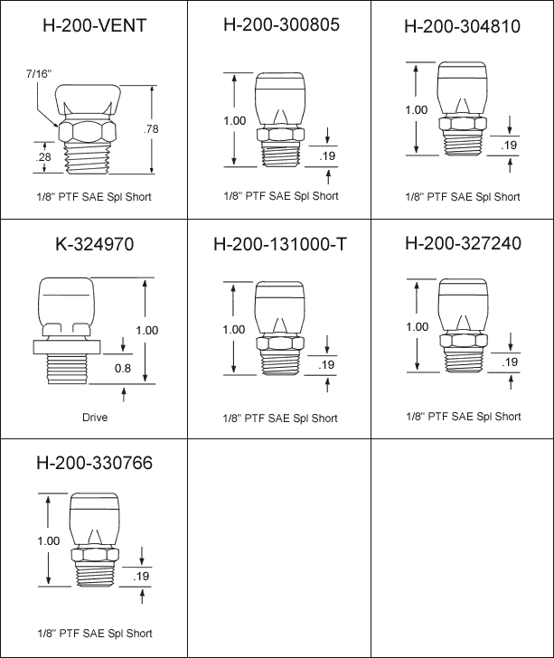 | H-200-330766 | 1/8" PTF SAE Special Short | Straight | 13 | 2-1/2 to 4 psi | 1 | 0.19 | 330766 | - | View Product > |